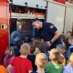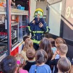 Ватрогаси су малишане почастили слаткишима и сваком од њих поклонили Породични приручник за понашање у ванредним ситуацијама и сликовницу Азбука безбедности за ђаке.